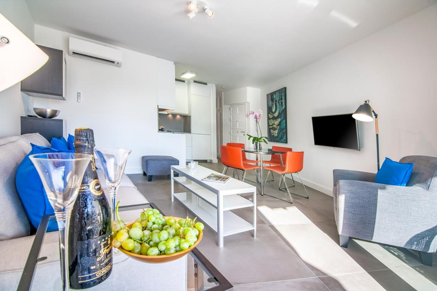 The spacious apartment has 2 bedrooms, 1 bathroom, bed linen, towels, a flat-screen TV with satellite channels, a dining area, a fully equipped kitchen, and a terrace with sea views. A private entrance leads gueststhe apartment,they can enjoy some wine or champagne. This apartment is non-smoking and soundproof.